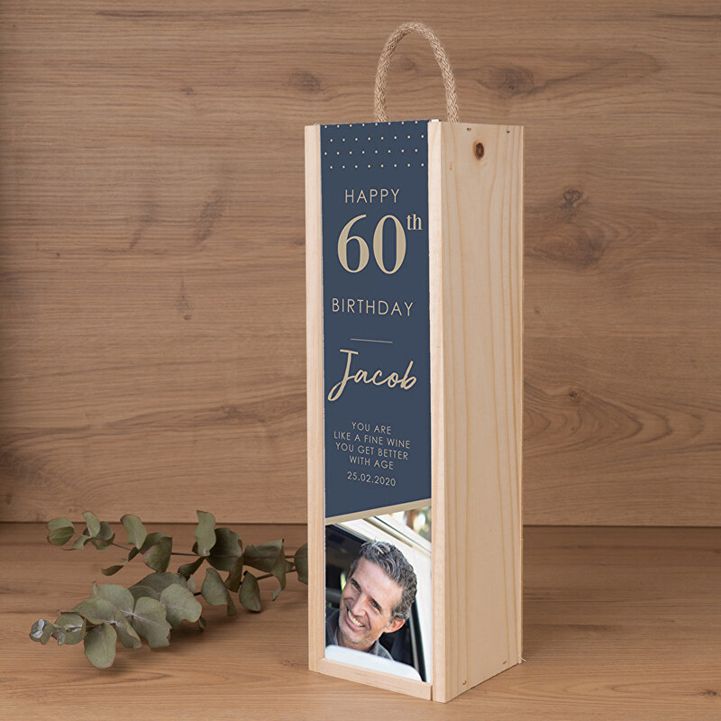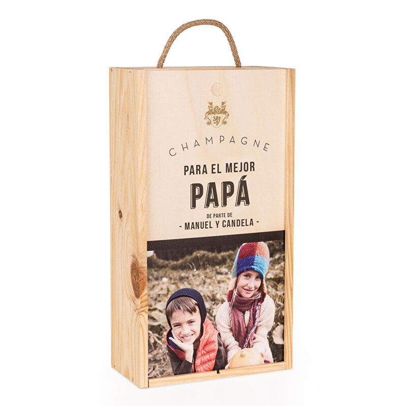 Cajas de madera para regalar vinos. La caja está hecha de madera natural y se personaliza la tapa corrediza, que es de ChromaLuxe, con la fotografía, diseño o texto que quieras. Gracias a su material, permite la máxima calidad en cuanto al color. Además, en la parte superior incluye un asa de cuerda para que