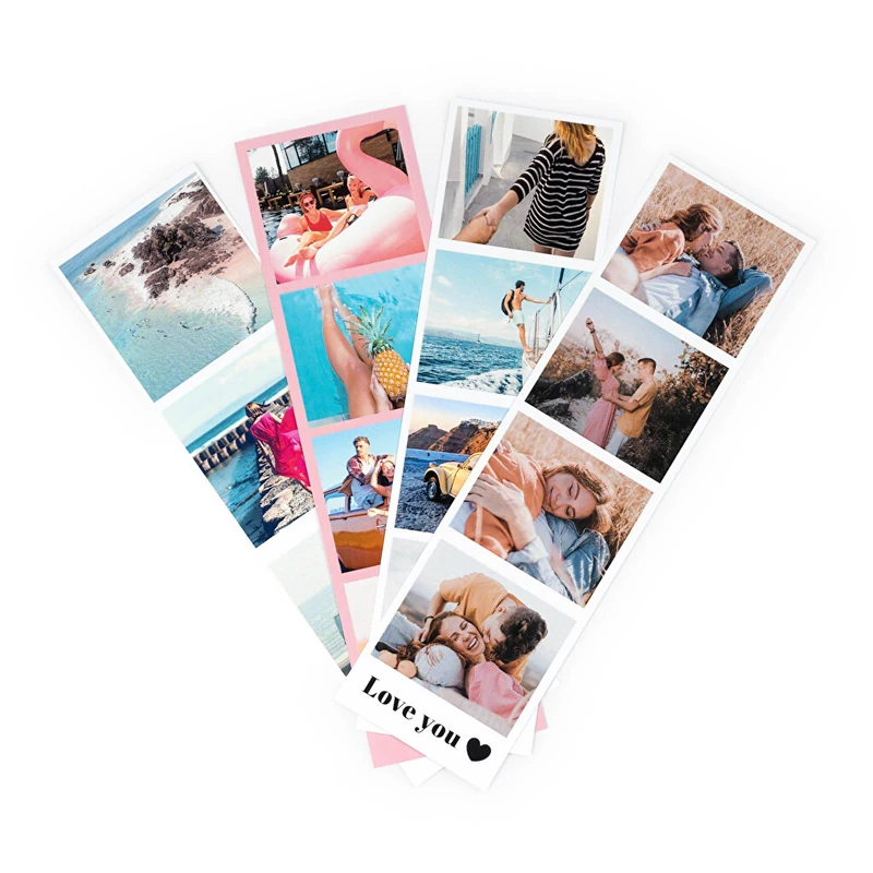 Pack de 4 tiras de fotos en formato fotomatón en papel laminado mate de 300 gr. Se trata de unas tiras en formato alargado, en las cuales podrás colocar tus fotos favoritas: selfies, fotografías con tus amigas, etc… . En nuestro Editor Online podrás elegir entre algunas plantillas prediseñadas, para poder crear tus tiras de