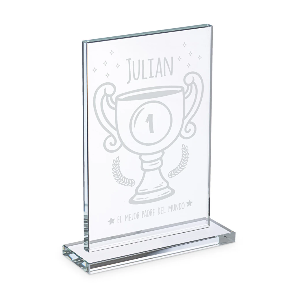 Trofeo grabado rectangular. El trofeo tiene forma rectangular y tiene una base más ancha que la propia placa (también en forma de rectángulo) para que se sujete perfectamente. El grabado a láser que se realiza sobre el trofeo es de gran calidad y hará que elijas el diseño que elijas sea perfecto. Se entrega en