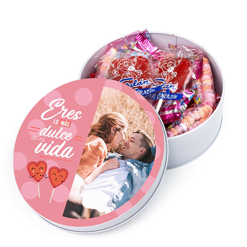 Nuestras cajas personalizadas con chuches y bombones son preciosas y dulces, a partes iguales, y encantarán a todo el que las reciba, eso está garantizado. Contamos con cajas metálicas que podrás personalizar como quieras, ya sea de entre los diseños que te ofrecemos o creando el tuyo propio. Incluye tarjetita en blanco para que puedas