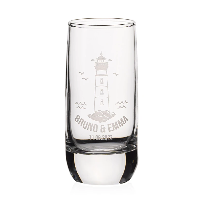 Vaso de chupito de cristal personalizado con la foto o imagen que tu quieras. Puedes regalar este chupito personalizado como detalle de boda con foto de los novios, nombre y fecha de la boda. También para bares y restaurantes, añadiendo el nombre y el logo.