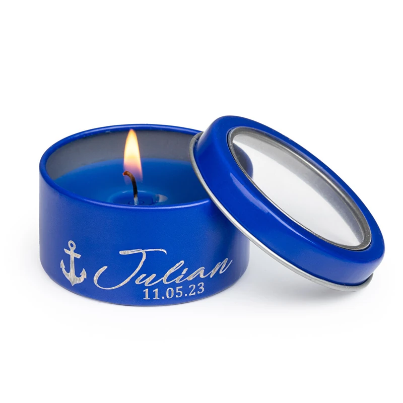 Vela aromática en caja metálica: con esta bonita vela no dejarás indiferente a nadie. Se trata de una vela que va dentro de una cajita metálica con tapa con ventana transparente, que podrás personalizar con una frase, nombre alrededor de la caja. Su aroma de vainilla es especialmente cálido y tranquilo. Podrás elegir entre distintos…