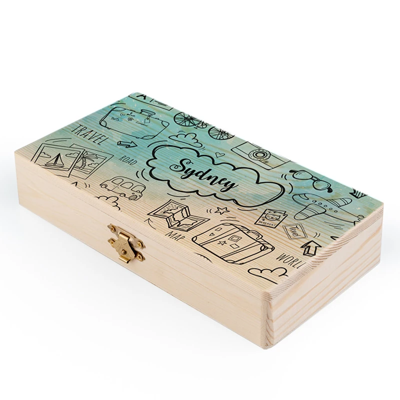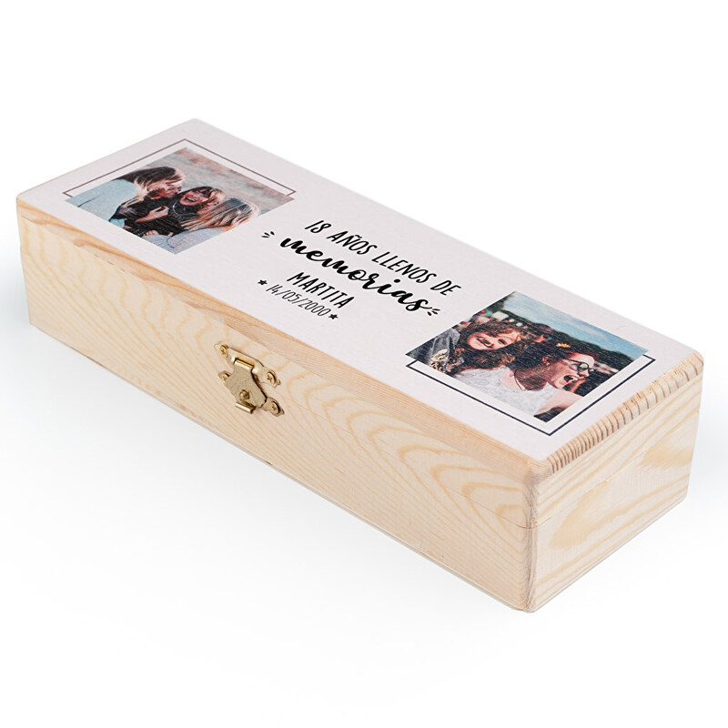 Cajas de madera de 20×10,5 cm personalizadas con las fotos y textos que tu quieras. Están hechas de madera natural y la impresión se hace a todo color directamente sobre esta. Puedes elegir la textura de la personalización, es decir, si prefieres que el diseño esté ligeramente integrado con el material o no. Impresión de…