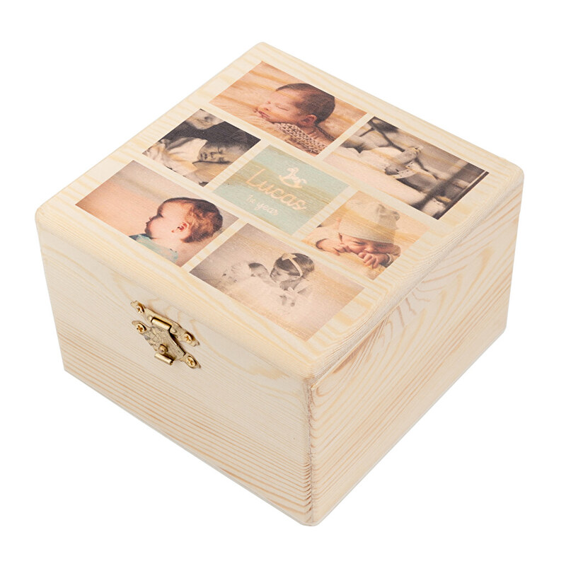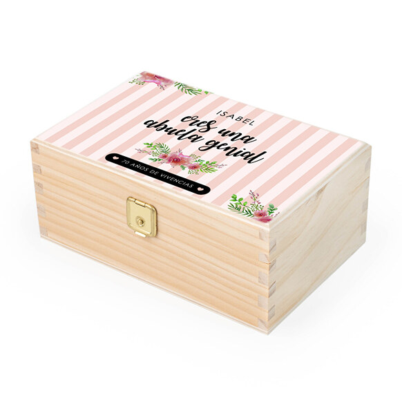 Cajas de madera de 21×18 cm personalizadas con las fotos y textos que tu quieras. Están hechas de madera natural y la impresión se hace a todo color directamente sobre esta. Puedes elegir la textura de la personalización, es decir, si prefieres que el diseño esté ligeramente integrado con el material o no. Impresión de…