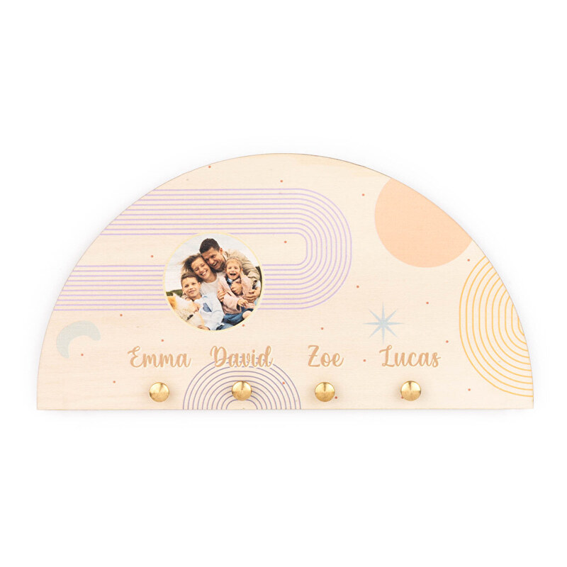 Cuelgallaves de madera personalizados. Es un cuelga llaves original, práctico, y está fabricado en madera de gran calidad y con unos colgadores para las llaves en color dorado que harán que el recibidor de tu casa luzca como nunca. Este formato de cuelgallaves familiar con forma semicircular con cuatro colgadores dorados es ideal para poder…