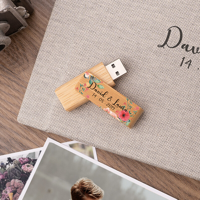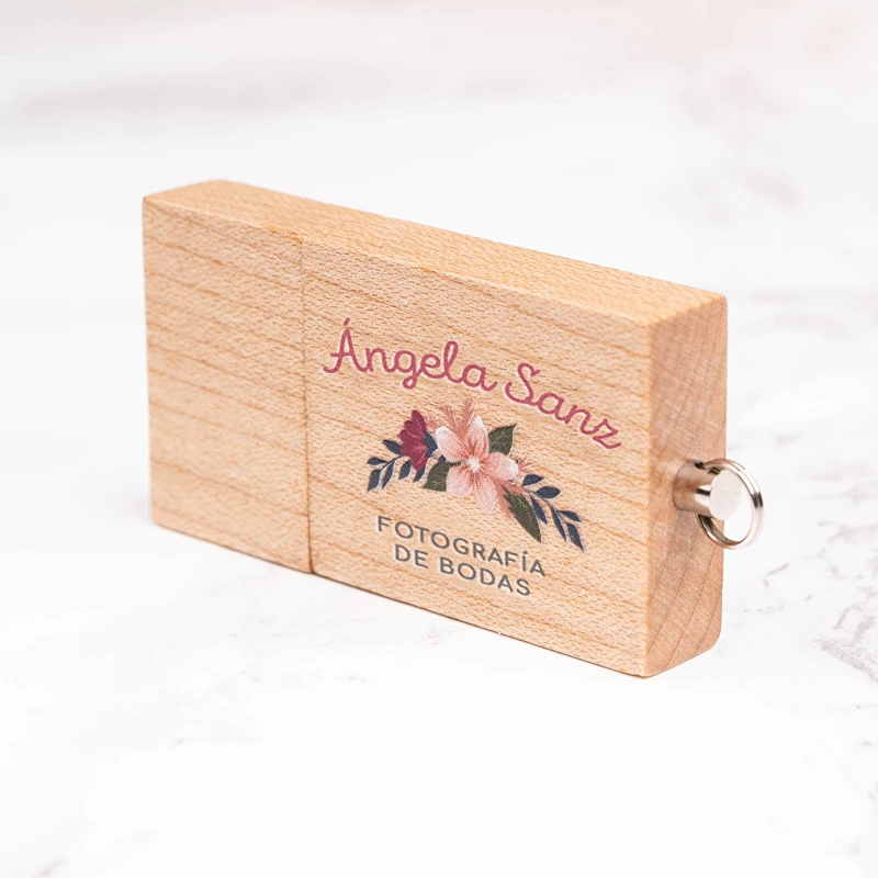 Un regalo exclusivo y de buen gusto. Nuestro USB de madera Personalizado tiene una capacidad de 16 GB y se personaliza por una sola cara. El pendrive y la carcasa giratoria son de madera. Sin necesidad de pedido mínimo Esto hace que sea un regalo especialmente recomendado para bodas, bautizos y comuniones.