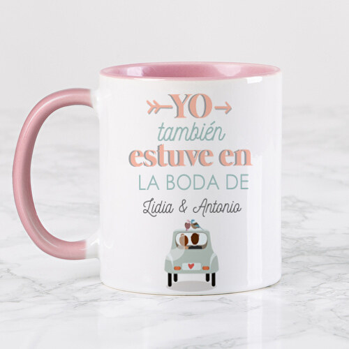 Taza de desayuno con diseño especial para bodas. Personalizado con el nombre de los novios . Impresión total hasta el borde de la taza. Apta para lavavajillas y microondas. Personaliza este detalle único para regarle a los invitados.