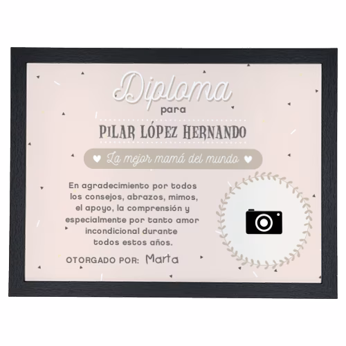 Regalo especial para el día de la madre: diploma personalizado con la foto y el nombre de tu mamá. Un regalo especial para una persona especial. Foto enmarcada 30×40 cm. Montaje sobre cartón pluma rígido (foam) de 5 mm. Enmarcado en madera (varios colores a elegir). Incluye soporte para colgar.