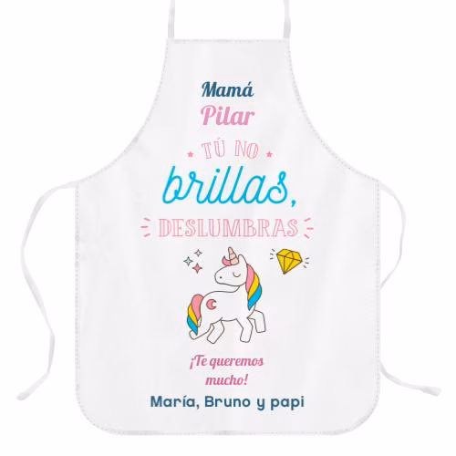 Delantal Personalizado con Diseño “Mamá, tu no brillas, deslumbras”. Crea tu propio delantal personalizado, con cualquier foto, collage de fotos, diseño, frases, el nombre del cocinero, etc. Puedes personalizar el 100% del delantal por la parte frontal. Está hecho en tela Panamá impermeable, de alta calidad y resistente. Medidas delantal adulto: 62×82 cm. Apto para…