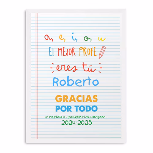 Regalo especial para l@s profes de nuestros hijos: diploma personalizado con un diseño especial con los nombres de clase y el de la profesora. Un regalo especial para una persona especial. Foto enmarcada 30×40 cm. Montaje sobre cartón pluma rígido (foam) de 5 mm. Enmarcado en madera (varios colores a elegir). Incluye soporte para colgar.