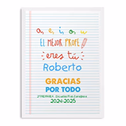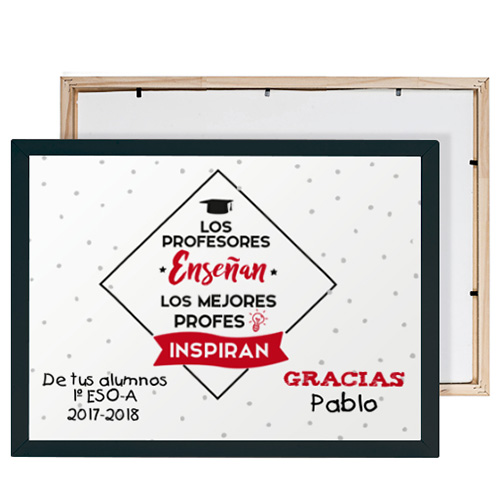 Regalo especial para l@s profes de nuestros hijos: diploma personalizado con un diseño especial con los nombres de clase y el de la profesora. Un regalo especial para una persona especial. Foto enmarcada 30×40 cm. Montaje sobre cartón pluma rígido (foam) de 5 mm. Enmarcado en madera (varios colores a elegir). Incluye soporte para colgar.