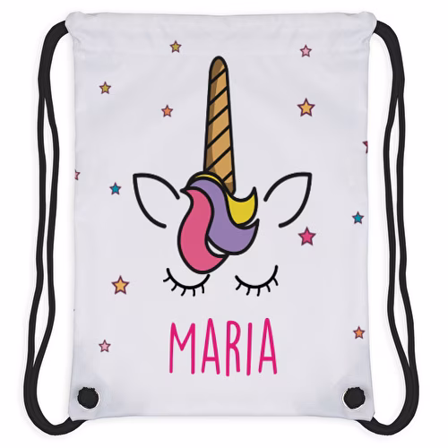 Mochilas de cuerdas infantiles personalizadas con diseño “Unicorn”. Perfectas para llevar el almuerzo al colegio, escuela o guardería; o a las actividades extraescolares. Puedes personalizar por las 2 caras, y con impresión total, El interior es impermeable, para una fácil limpieza, y para proteger la mochila de escapes de líquidos de bebidas en el interior….