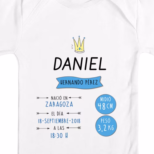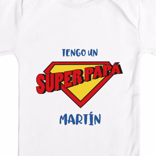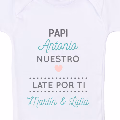 Body de bebé personalizado con un diseño especial para el día del padre. Añade el nombre que tu desees y haz un regalo único y original. Bodys 100% algodón, con tres colores a elegir (rosa, blanco y azul) y tallas de 3 a 24 meses. Impresión digital de alta calidad. Apto para la lavadora y…