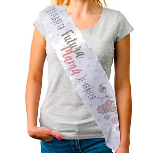 Bandas de miss personalizadas con diseño especial para futuras mamás. Se personalizan por separado la parte frontal y la parte de la espalda. Impresión alta calidad a todo color. Medidas: 180 x 12,5 cm. Crea tu propia banda de miss o mister, personalizada con el texto que quieras, imágenes, diseños.