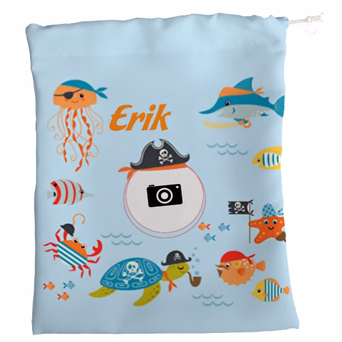 Esta Mochila-Bolsa merienda personalizada con diseño “Pirata” es ideal para niños. Con su impresión total, puedes personalizar el 100% de la superficie de la bolsa con tus fotos o diseños. Muy práctica para llevar el bocadillo, zumo, o cualquier cosa que queráis guardar. Apta para lavadora y secadora.