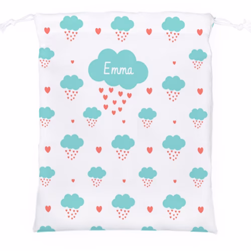 Esta Mochila-Bolsa merienda personalizada con diseño “Lluvia de Amor” es ideal para niños. Con su impresión total, puedes personalizar el 100% de la superficie de la bolsa con tus fotos o diseños. Muy práctica para llevar el bocadillo, zumo, o cualquier cosa que queráis guardar. Apta para lavadora y secadora.