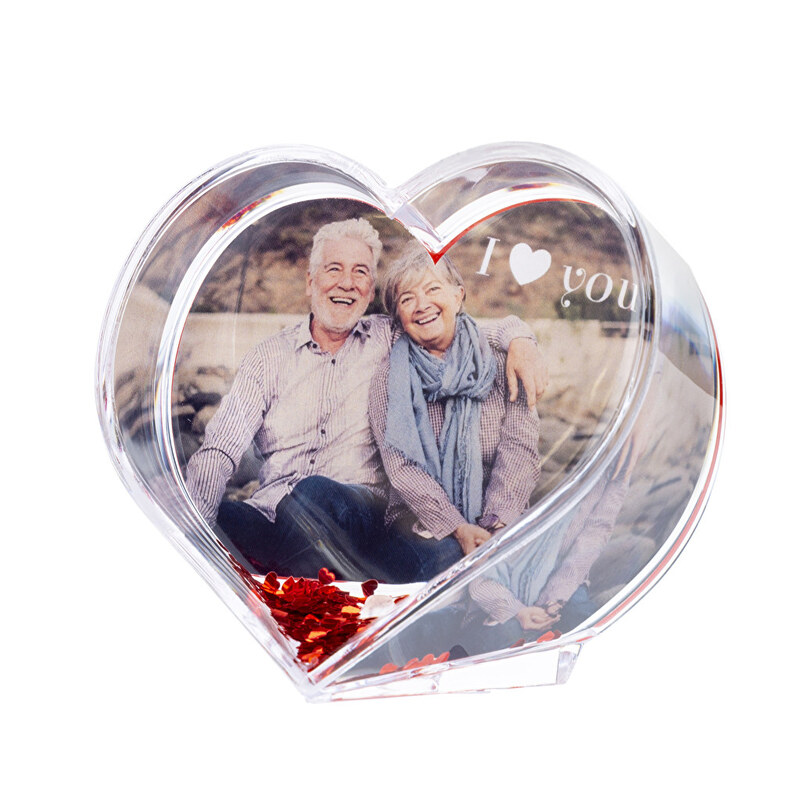 Bola de nieve personalizada con forma de corazon. La purpurina que hay dentro del líquido tiene también forma de pequeños corazones. 95ØX90X45 mm. Zona personalizable: 91X66 mm. Peso de 233 gr. Una bola de nieve personalizada muy romántica y original.