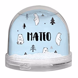 Bola de nieve con un diseño especial de osos poloares, personalizada por las dos caras. Tiene forma de semiesfera, y la purpurina que hay dentro del líquido tiene forma de copos de nieve.