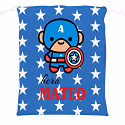 Esta Mochila-Bolsa merienda personalizada con diseño “Super Hero” es ideal para niños. Con su impresión total, puedes personalizar el 100% de la superficie de la bolsa con tus fotos o diseños. Muy práctica para llevar el bocadillo, zumo, o cualquier cosa que queráis guardar. Apta para lavadora y secadora.