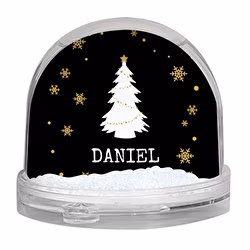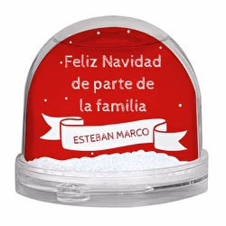 Bola de nieve con motivos navideños personalizada por las dos caras. Tiene forma de semiesfera, y la purpurina que hay dentro del líquido tiene forma de copos de nieve.