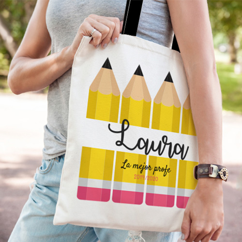 Bolsa de Tela Personalizada Tote Bag con diseños especial para profesoras y maestras. Este bolsa de tela personalizada está muy de moda, y consiste en un bolso grande, de forma rectangular, con prácticas asas para llevar en la mano o colgado del hombro. Tamaño de 41X65 cm. Un regalo original y práctico.