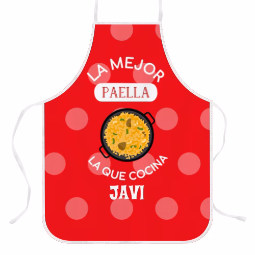 Delantal Personalizado con Diseño “La mejor paella”. Crea tu propio delantal personalizado, con cualquier foto, collage de fotos, diseño, frases, el nombre del cocinero, etc. Puedes personalizar el 100% del delantal por la parte frontal. Está hecho en tela Panamá impermeable, de alta calidad y resistente. Medidas delantal adulto: 62×82 cm. Apto para lavadora.