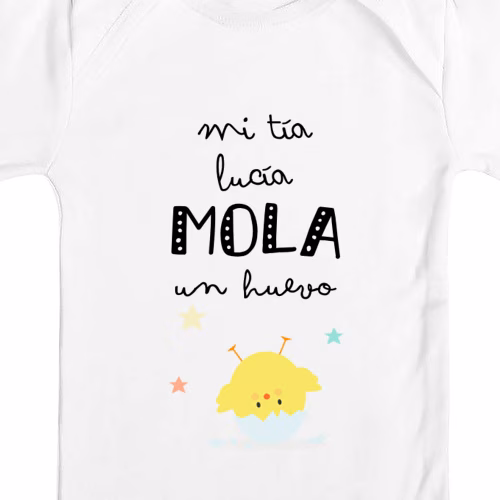 Body personalizado de manga larga con nuestro diseño “Mi Tía mola un Huevo”. Body 100% de Algodón y con corchete en la entrepierna. Tallas de 3 a 24 meses. Impresión digital de alta calidad. Haz un regalo original y único.