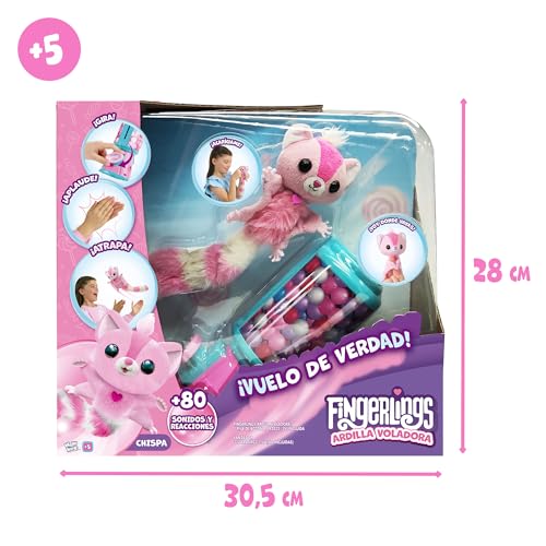 Fingerlings ha tomado el vuelo… ¡con la nueva Ardilla Voladora! Con un proceso mágico y sencillo; coloca tu ardilla en su lanzador, gira la manivela para cargarlo, da un paso hacia atrás y aplaude dos veces.. ¡¡Tu ardilla volará hacia tus brazos!! Haz cosquillas y acaricia tu Ardilla Voladora para escuchar sus 75 sonidos y reacciones. Además siente cuando la lanzas hacia arriba y se divierte mucho. Su lanzador interactivo tiene más de 25 sonidos y diferentes melodías. Dispara hasta 1 metro de distancia una y otra vez.