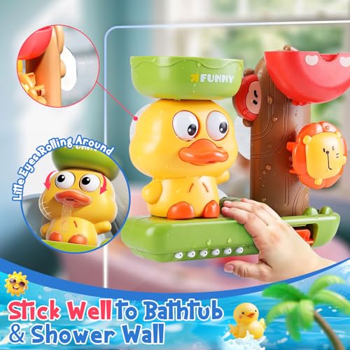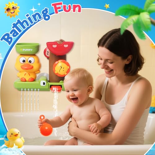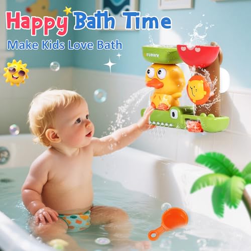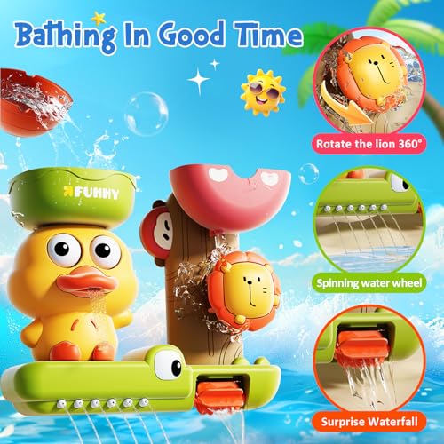 Divertidos juguetes de baño para bebés :Esto no es solo un juguete de baño, ¡es una aventura en la cascada! Use la cucharada incluida para verter agua en el recipiente superior. Observe la gravedad de su magia mientras los ojos del pato rodan, el león gira y el agua de pico de pato y cocodrilo de la boca. ¡A tus hijos les encantará bañarse de ahora en adelante! Regalos Juguetes de baño para niños pequeños 1 2 3 años Niña Cumpleaños