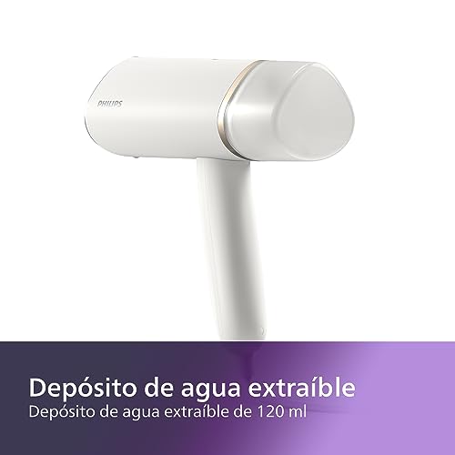 DEPÓSITO DE AGUA EXTRAÍBLE DE 120 ML: Fácil de rellenar bajo el grifo. La plancha vertical viene con un depósito de agua extraíble de 120 ml para vaporizar un mayor número de prendas